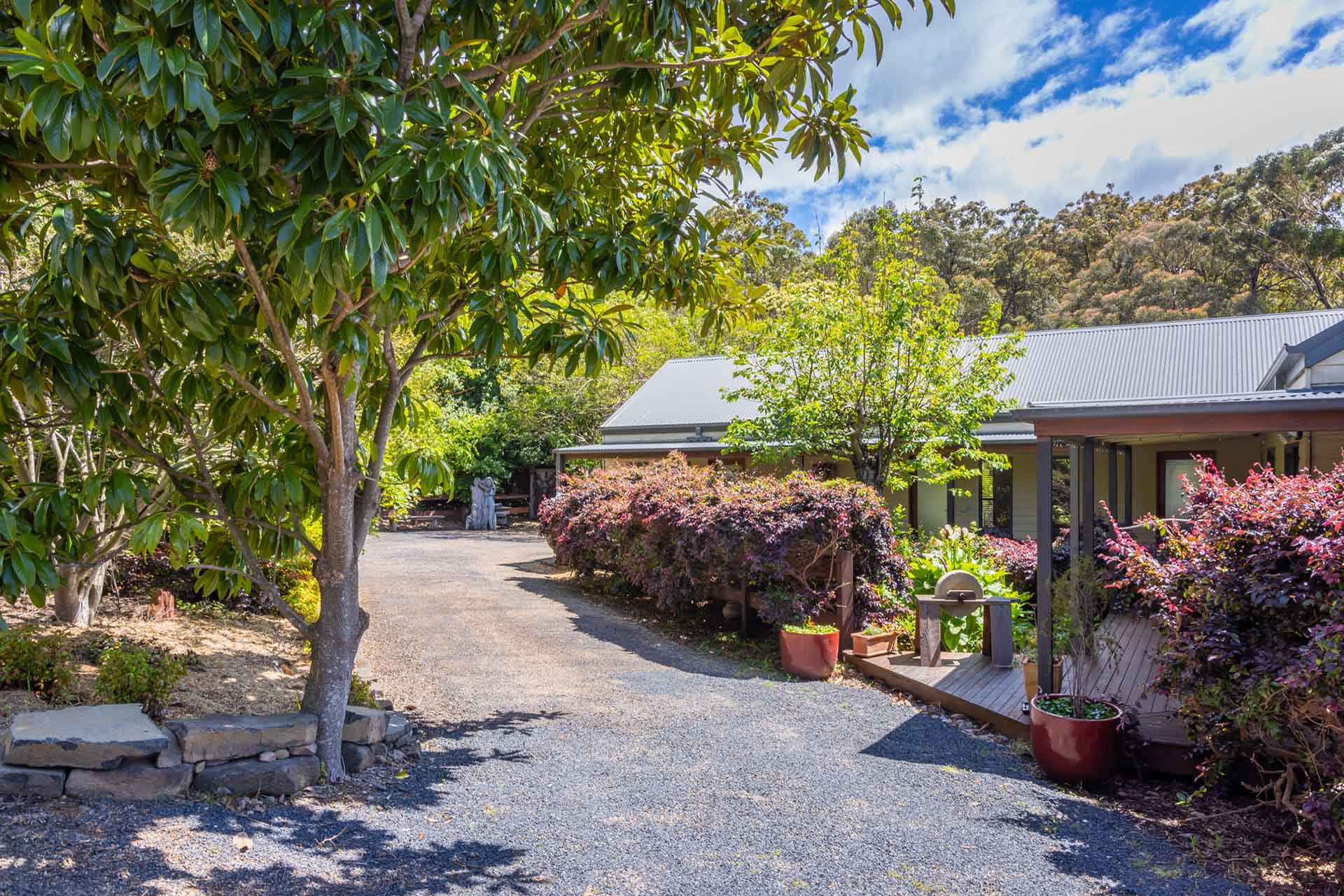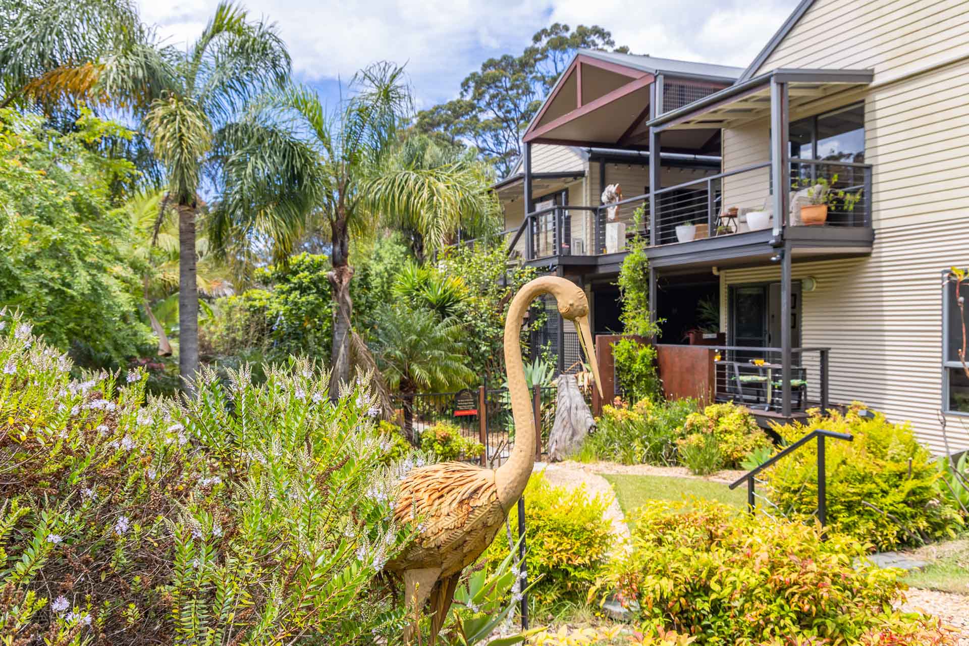 Sunny north facing terrace with table & chairs, overlooking landscaped gardens & the outdoor pool with native bushland beyond