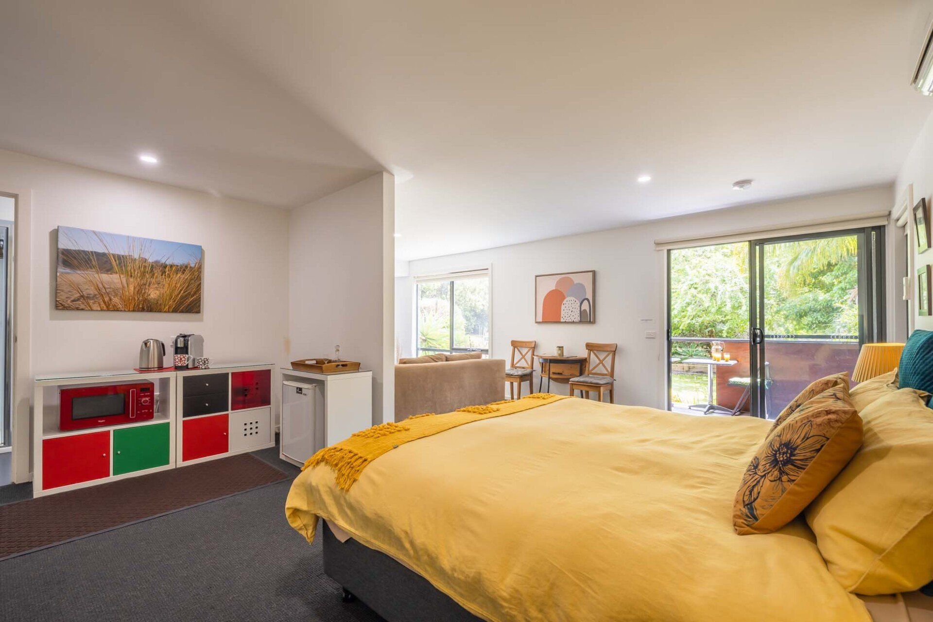 The King Studio combines style and comfort, along with warm and welcoming hospitality. The Studio is accessed via a garden pathway that includes six steps and overlooks the lush gardens and pool area with great views from the sunny deck.